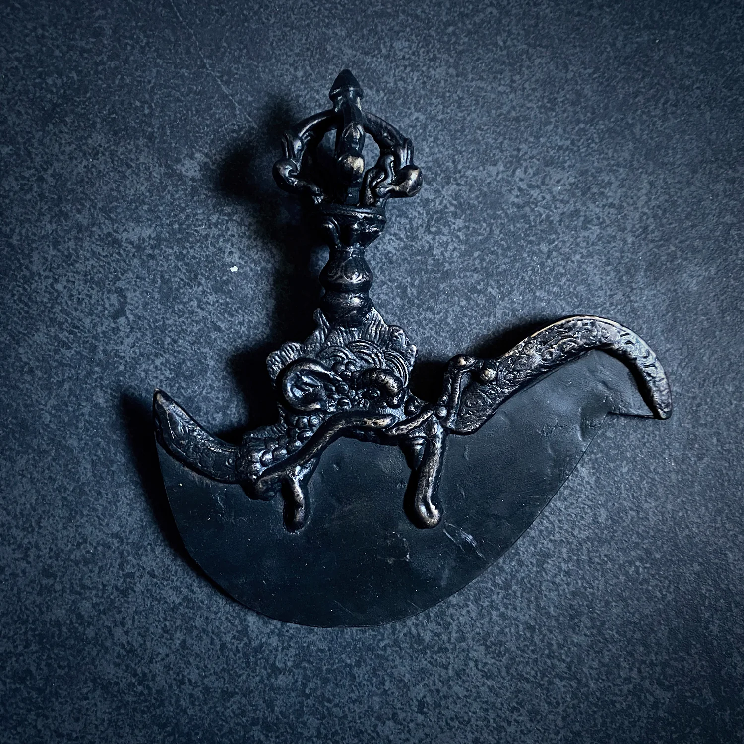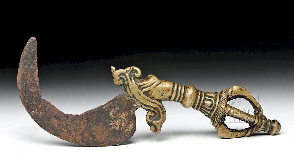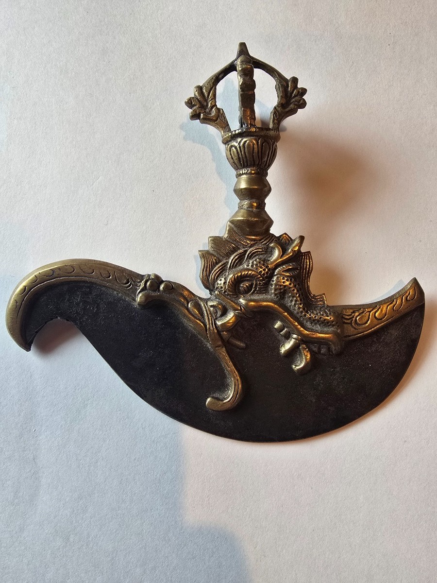 - Lưỡi dao cong: Biểu trưng cho trí tuệ Bát nhã (Prajna), khả năng nhìn thấu bản chất của vạn pháp, cắt đứt mọi ảo tưởng về sự tồn tại độc lập, vững chắc của các hiện tượng. Sự cong của lưỡi dao cũng gợi ý đến khả năng "quét sạch" mọi chướng ngại một cách hiệu quả.